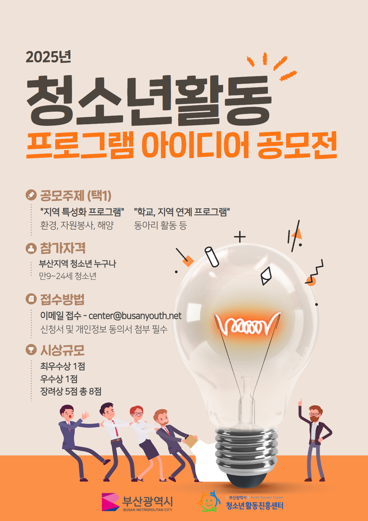 부산광역시청소년활동진흥센터에서는 청소년활동 현장에 청소년 자신들의 요구를 반영할 수 있는 프로그램 기획 및 청소년 참여 기회를 제공하기 위하여 「2025년 청소년활동 프로그램 아이디어 공모전」을 개최하오니 많은 관심과 참여바랍니다.